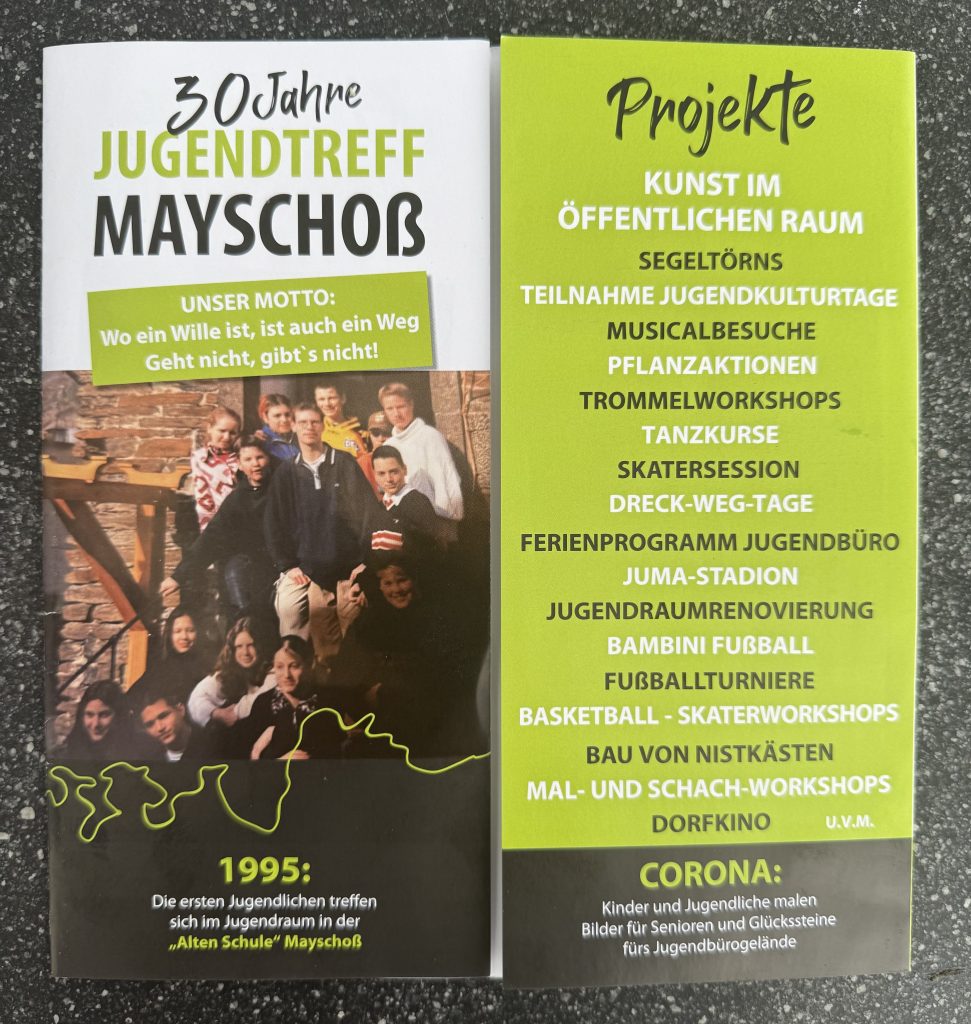 Durch die Flutkatastrophe Juli 2021 wurde zwar ein Großteil davon zerstört, aber nicht die Motivation und der Power des Jugendtreffs. Daher wurde Ende 2022 die Idee des von Kindern und Jugendlichen gewünschten Basketballfeldes, sowie der Skateranlage wieder aufgegriffen und bereits im August 2023 fand die Eröffnung des „ Juma-Stadions“ statt. Dieses wurde innerhalb von einer Rekordzeit in knapp 4 Monaten gebaut und finanziert durch großzügige Spenden zugunsten der Kinder und Jugend von Mayschoß. Ganz nach dem Motto: „Wo ein Wille, da ein Weg und geht nicht, gibts nicht“ wird sich der Jugendtreff auch in Zukunft, zwar in Wellen wegen den unterschiedlich starken Jahrgänge, auch weiterhin aktiv und positiv in Mayschoß am Dorfgeschehen beteiligen.